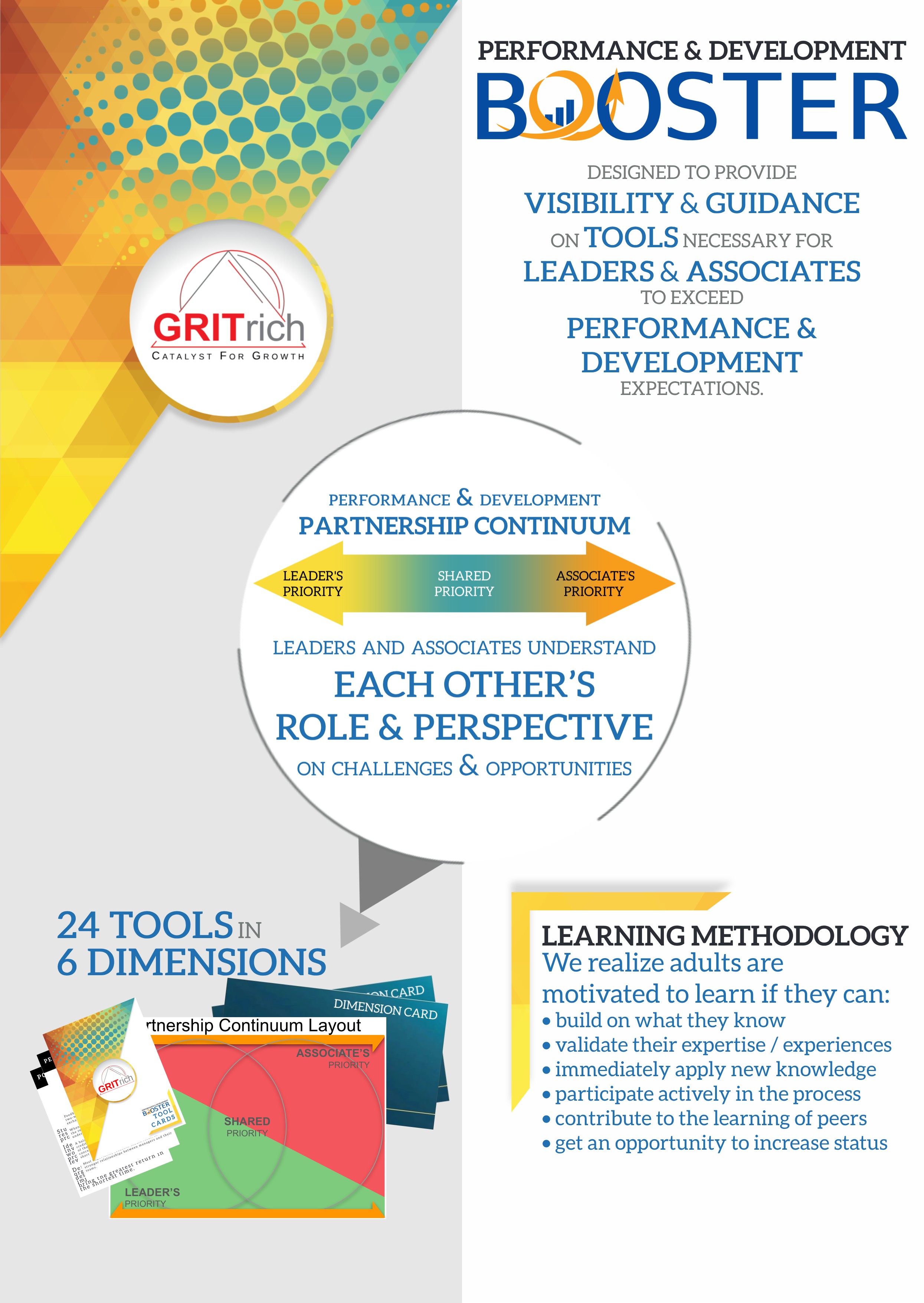 BOOSTER is designed to provide the visibility and guidance on the essential tools needed for success, both personally and professionally. To facilitate learning, we have divided different factors impacting performance and development into six DIMENSIONS and twenty four TOOLS.